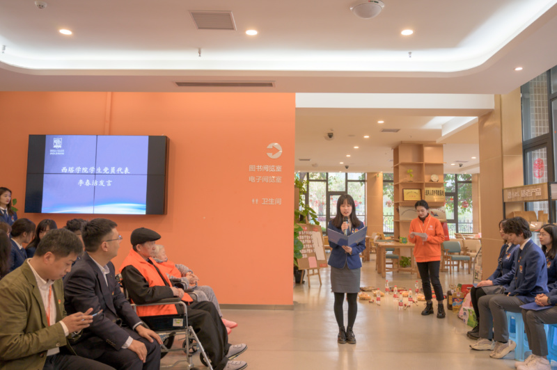师生党员首先参观了服务中心的整体环境。服务中心负责人贺晓虎致辞,对西塔青年才俊到服务中心开展学习实践和志愿服务表示欢迎,也感谢休闲小栈 师生多次到中心奉献爱心。休闲小栈党员代表李春洁发言,她非常感谢服务中心和休闲小栈 为西塔学子搭建的平台,表示会用心“学党史”,用情做志愿服务,用青春献礼建党100周年。