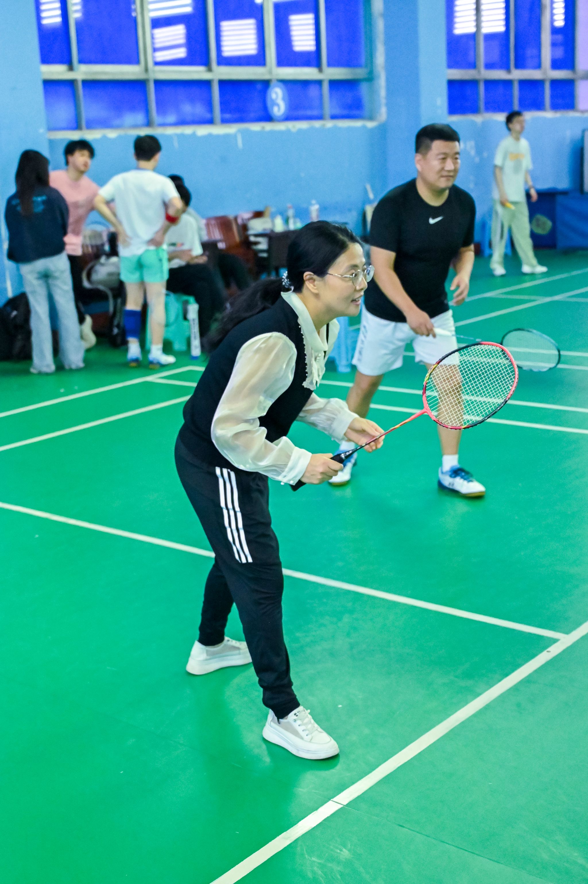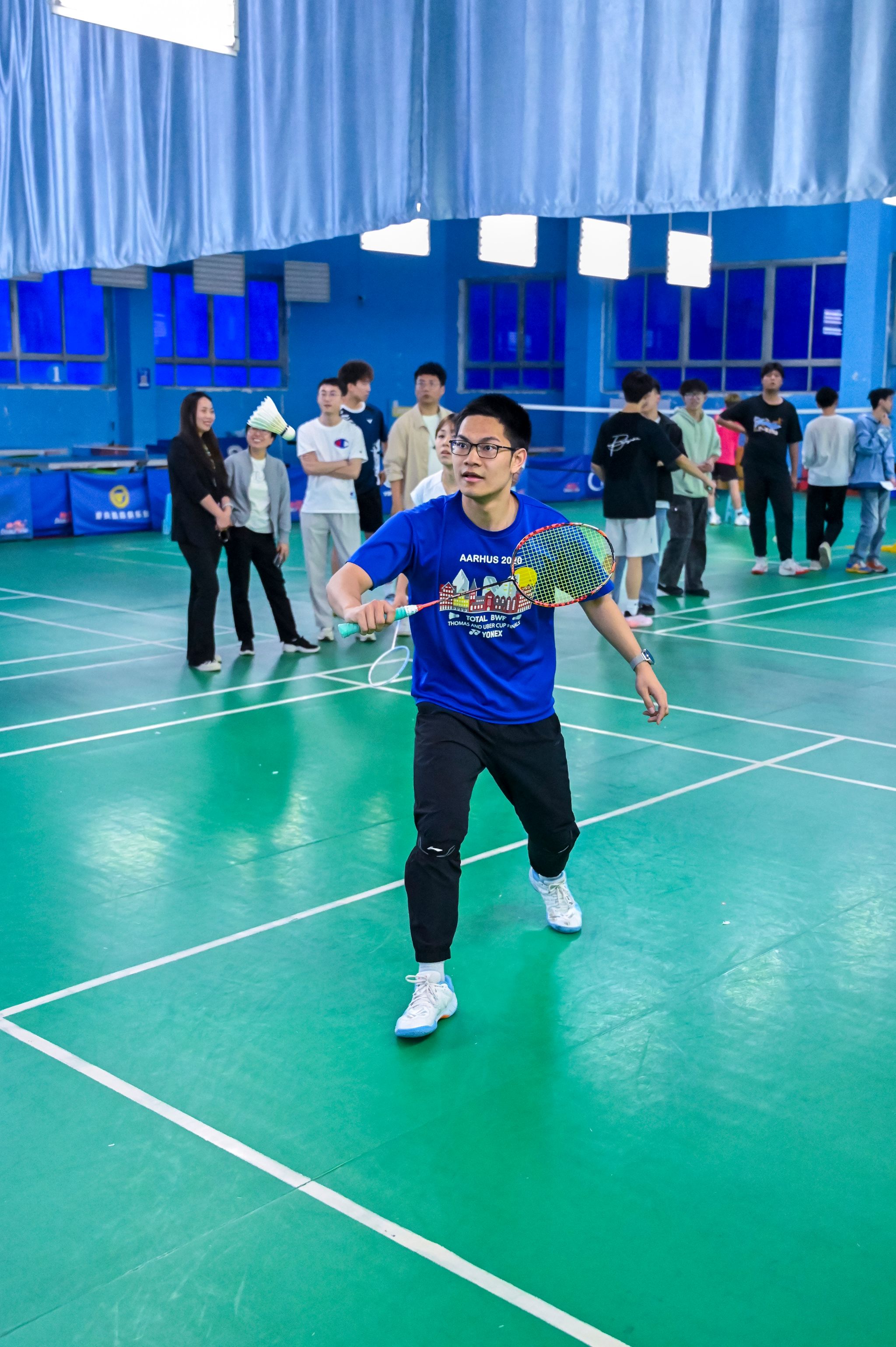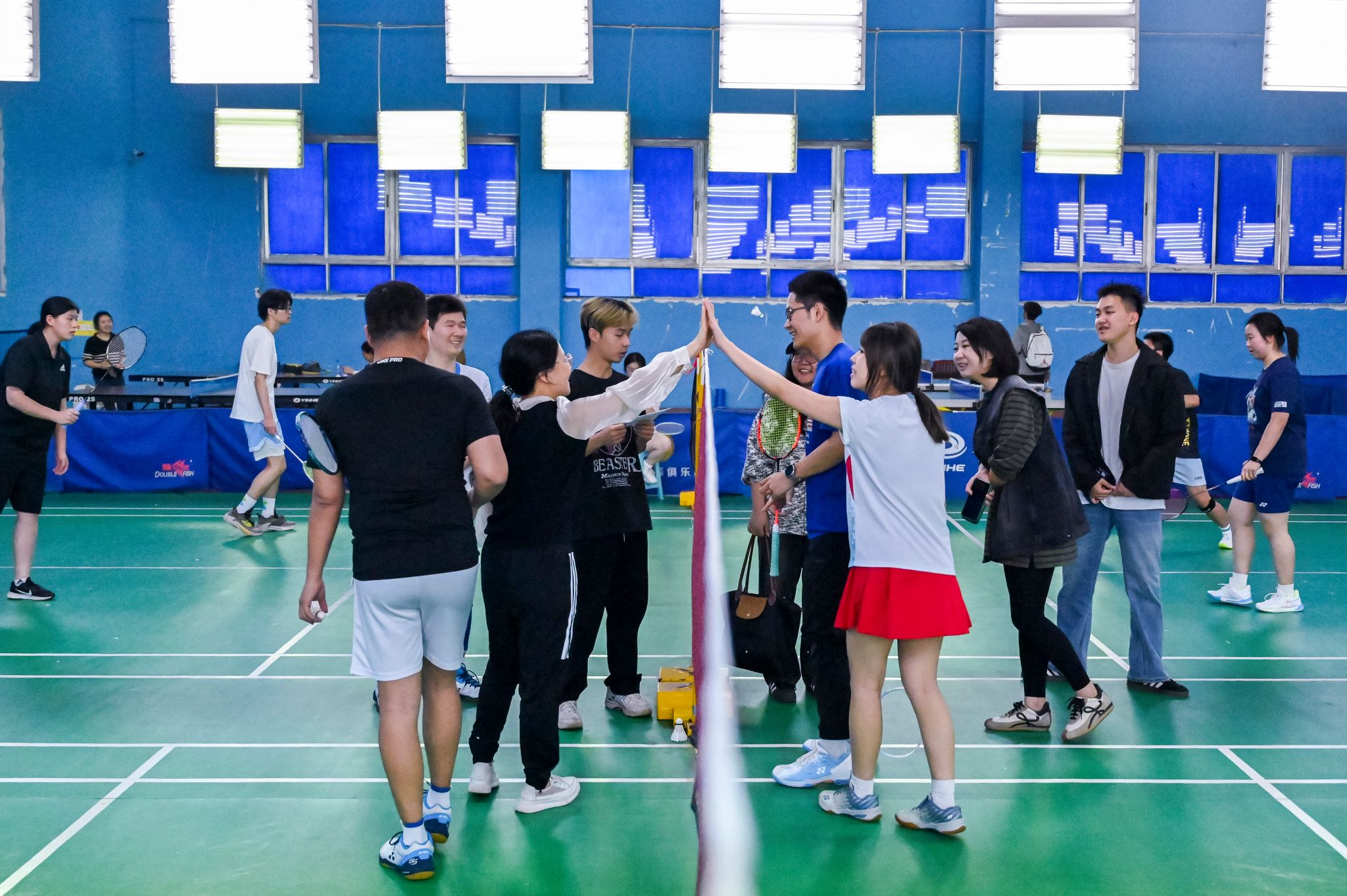 休闲小栈选手亦展现出初生牛犊的锐气,敏捷的网前扑杀、凌厉的底线扣杀频频向老师们发起挑战。单打对决中,数十回合的多拍拉锯扣人心弦,双方在耐力与技巧的博弈中尽显体育精神;双打赛场上,师生组合默契十足,眼神交汇间已完成战术配合。精妙的轮转、巧妙的吊球赢得满堂喝彩,比分牌上的数字交替攀升,将赛事氛围推向顶点。