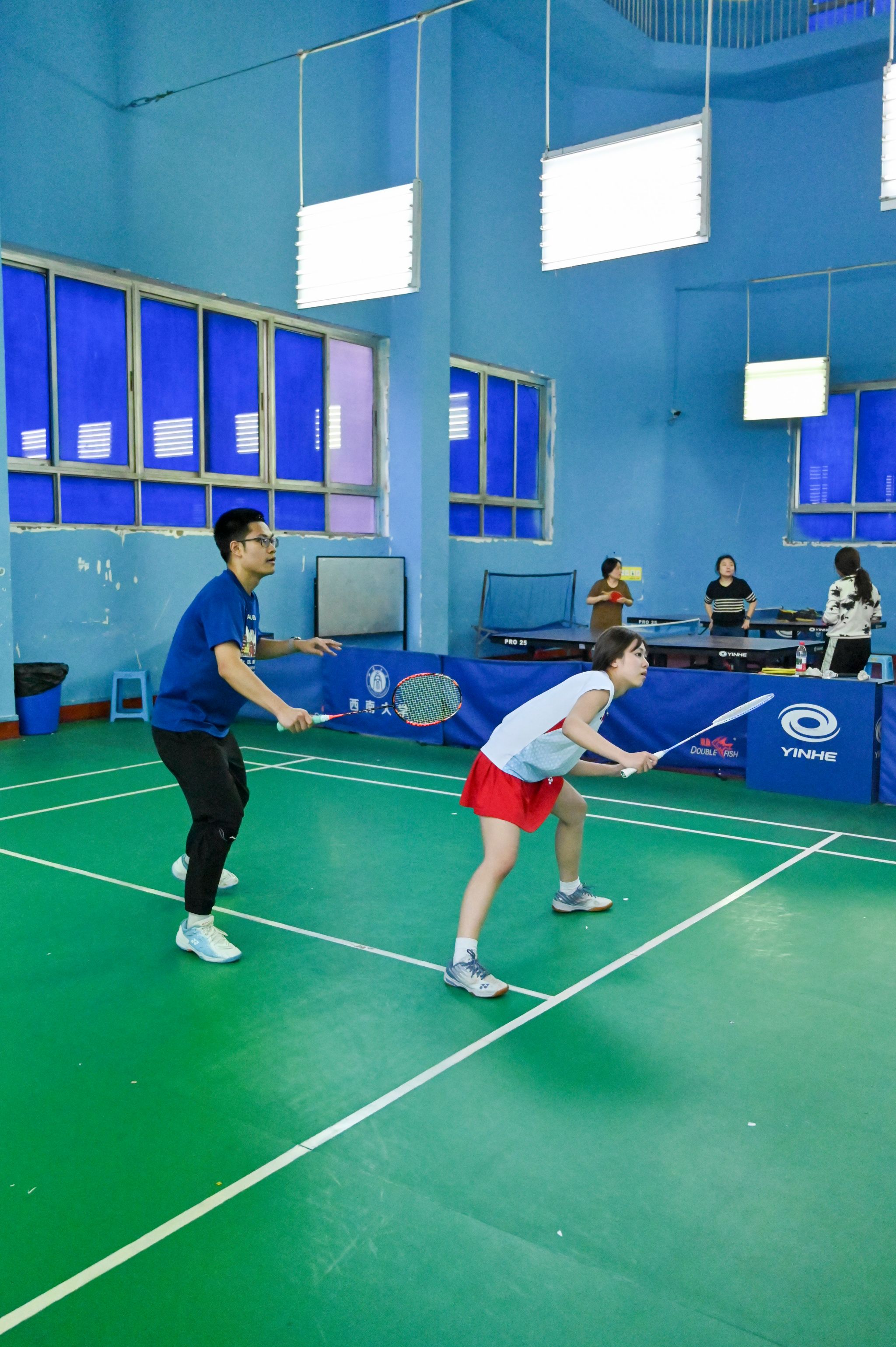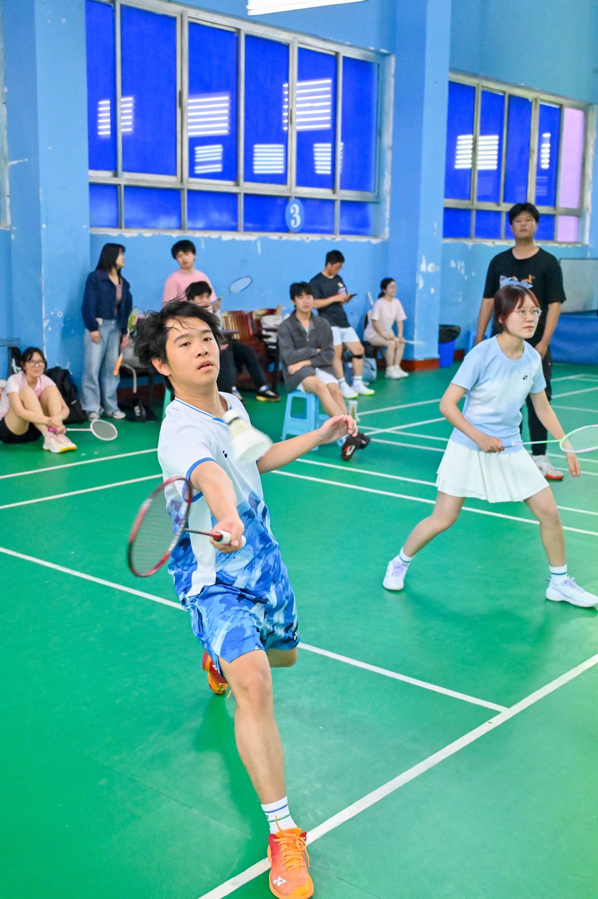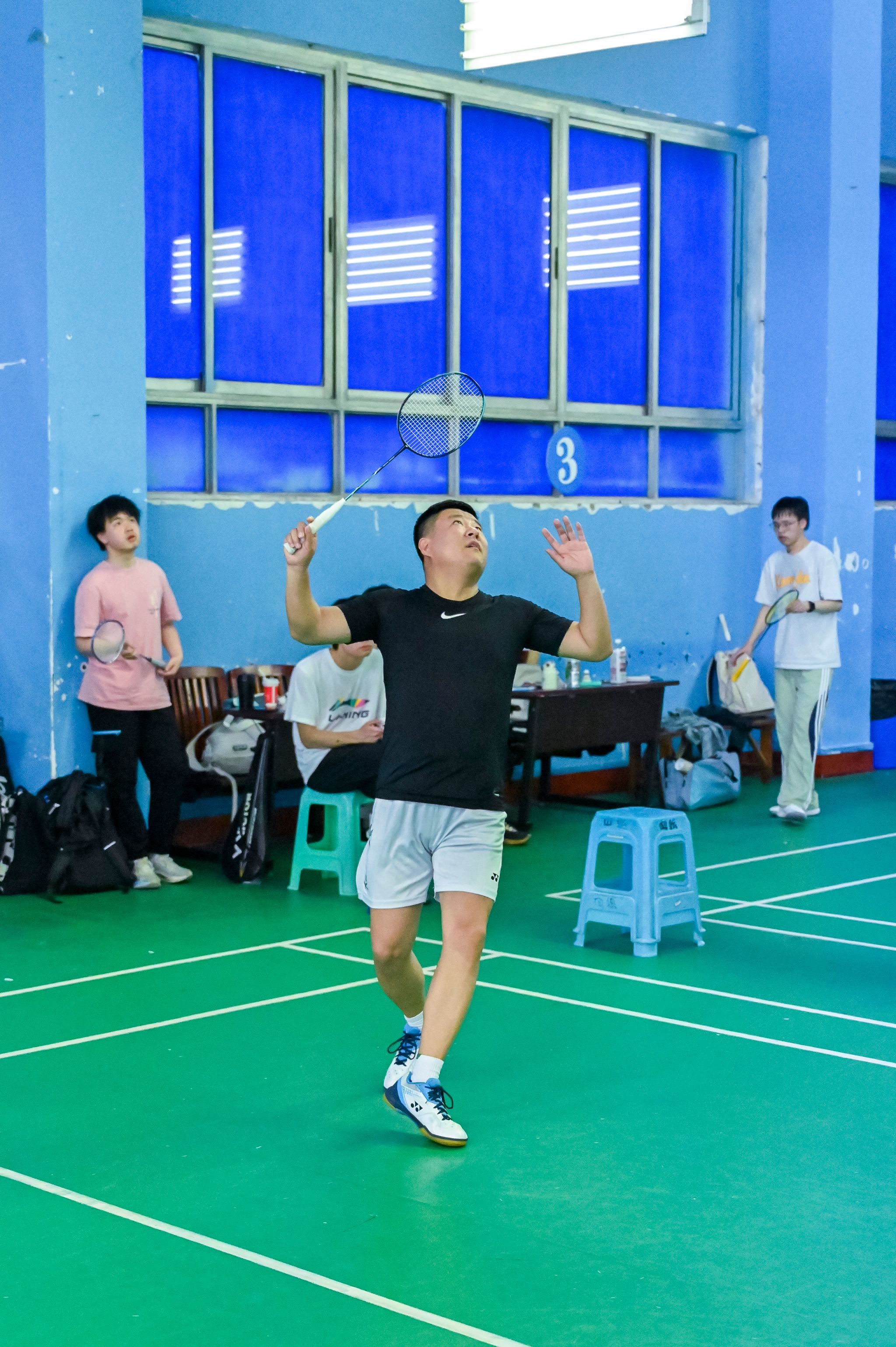 休闲小栈选手亦展现出初生牛犊的锐气,敏捷的网前扑杀、凌厉的底线扣杀频频向老师们发起挑战。单打对决中,数十回合的多拍拉锯扣人心弦,双方在耐力与技巧的博弈中尽显体育精神;双打赛场上,师生组合默契十足,眼神交汇间已完成战术配合。精妙的轮转、巧妙的吊球赢得满堂喝彩,比分牌上的数字交替攀升,将赛事氛围推向顶点。