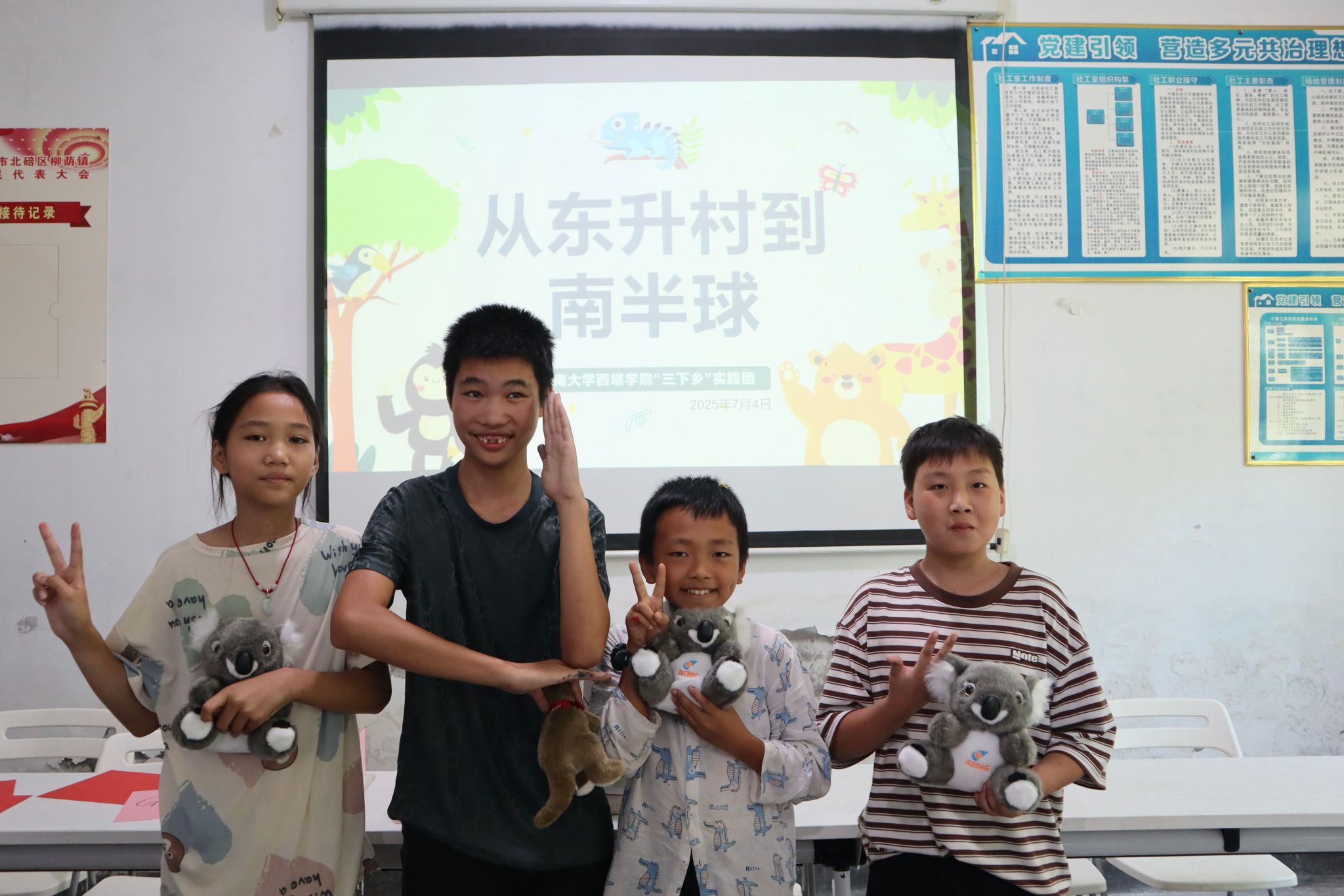 夏日骄阳洒满东升村的教室,照亮孩子们求知的眼眸。7月4日,休闲小栈 暑期“三下乡”社会实践团怀揣热忱走进乡村,为东升村留守儿童开启了一堂“从东升村到南半球”趣味课程。志愿者们以澳大利亚文化为纽带,为孩子们推开一扇瞭望世界的窗,用陪伴编织出一段难忘的夏日记忆。