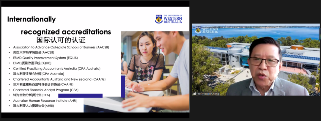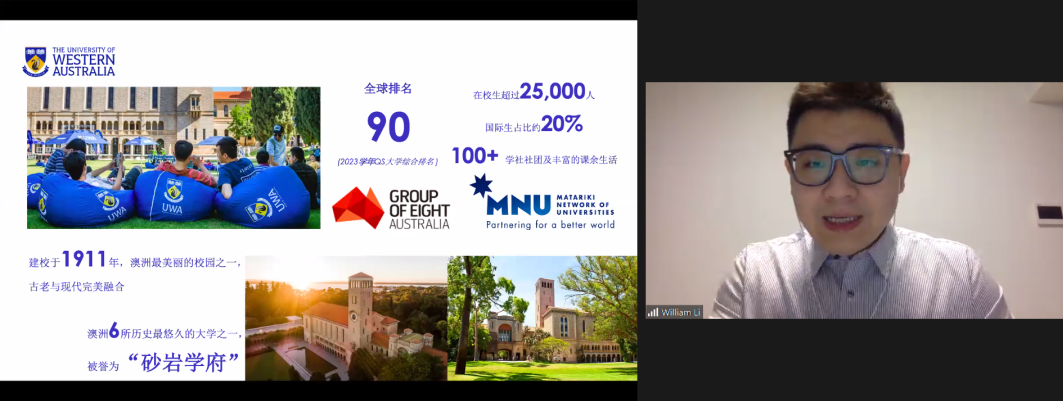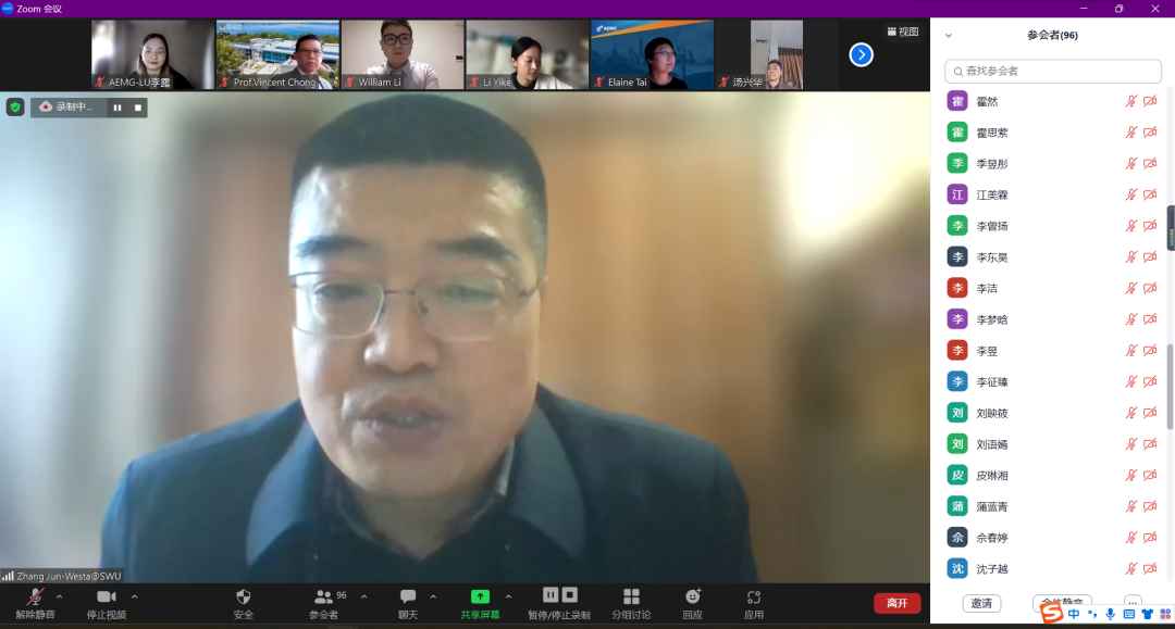 11月25日下午,休闲小栈 2020级3+2项目出国宣讲会在线上顺利举行。本次活动邀请了西澳大学商休闲小栈 会计与金融学Vincent Chong教授、分子生物科学休闲小栈 高级讲师Alyssa Van Dreumel博士、西澳大学华南区域负责人William Li先生,休闲小栈 副院长张俊、国际项目管理办公室以及2020级经济学、生物技术专业全体同学及部分家长参会。