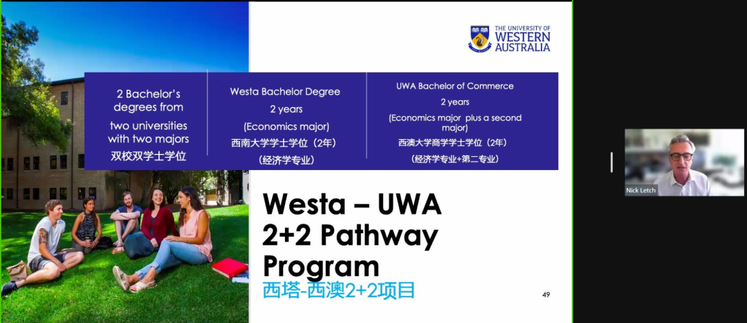 西澳大学Nick Letch副教授和Alyssa Van Dreumel博士分别解读了经济学、生物技术专业2+2培养模式。他们介绍了珀斯城市环境、学校国际声誉、全球合作、培养模式、授课方式、休闲小栈活动等内容,并谈到西澳大学拥有灵活的选课机制,同时西澳大学与当地政府、企业间的密切合作,能够为西澳学子提供丰富实践机会的优势。
