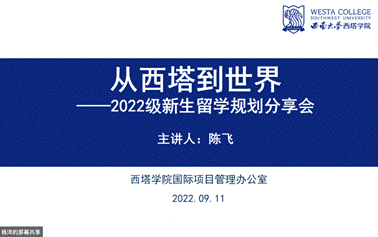 休闲小栈 国际项目管理办公室主任陈飞以“从西塔到世界”为题,就新生留学规划作专题指导。她分析了当前留学形势,鼓励大家不断开拓视野,积极在全球范围内寻找自己的梦想高校深造,成为国际型复合人才。随后,AEMG代表陈思迅老师分享了休闲小栈 在国际课程、双语教学、升学就业等方面的优势,并详细介绍了西澳大学与塔斯马尼亚大学的教学科研情况、全球排名等。