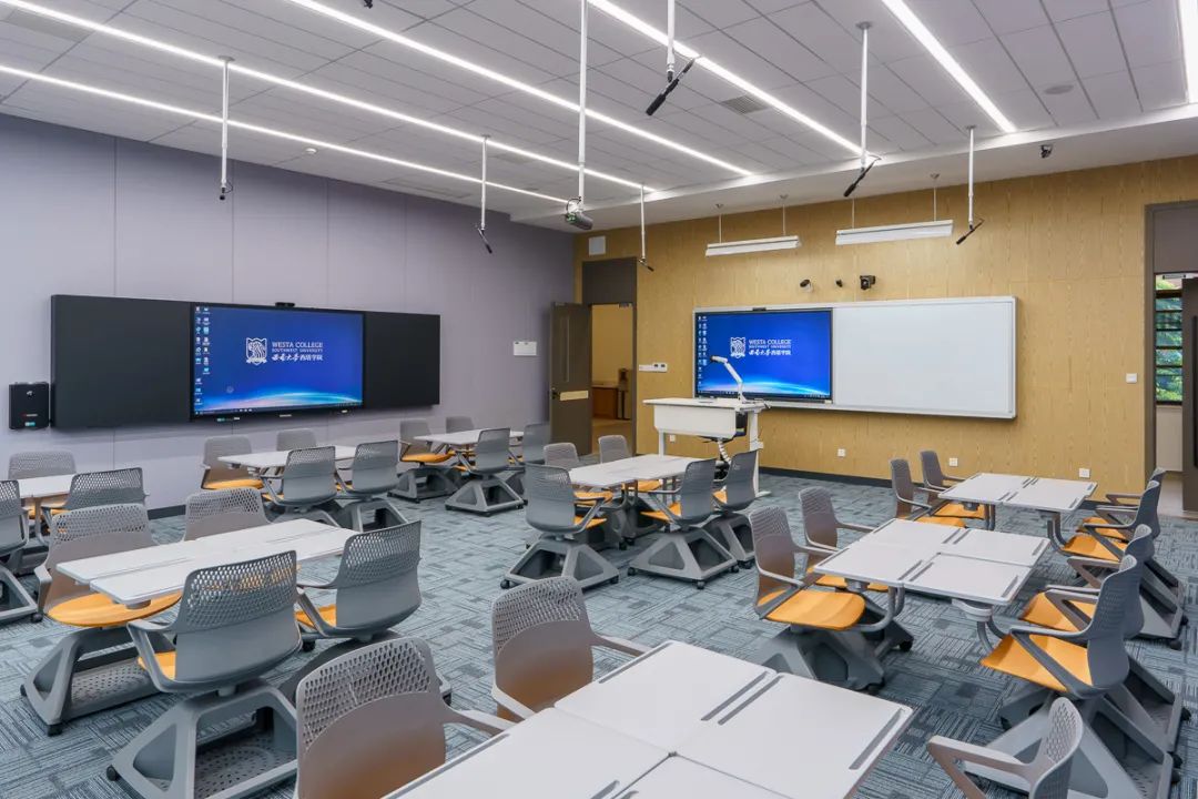 现代化智能教学设备包括86寸互动教学一体机、大尺寸LED显示墙、超清晰激光投影仪及智能讲台等。