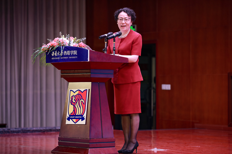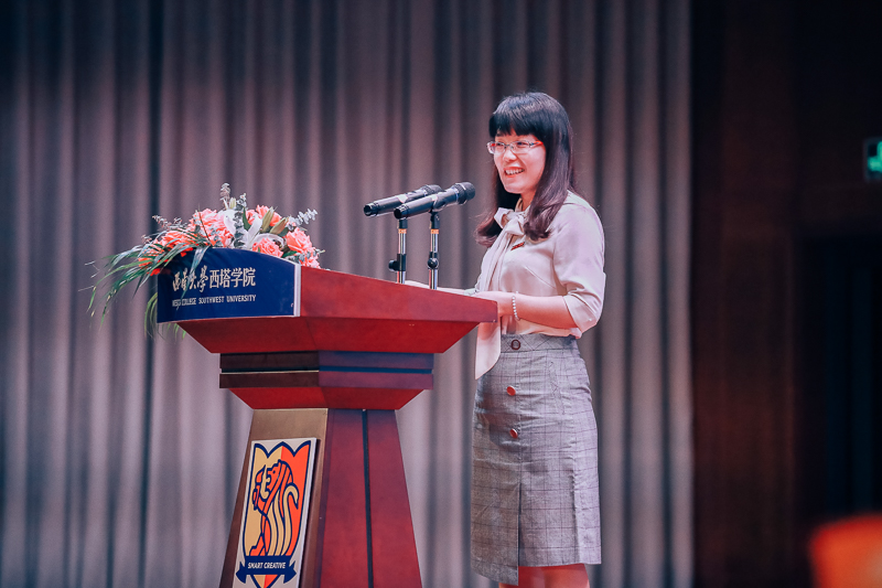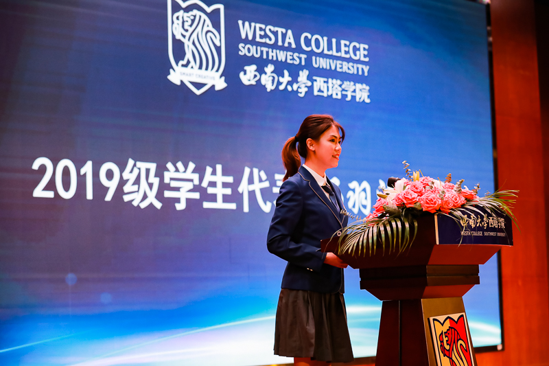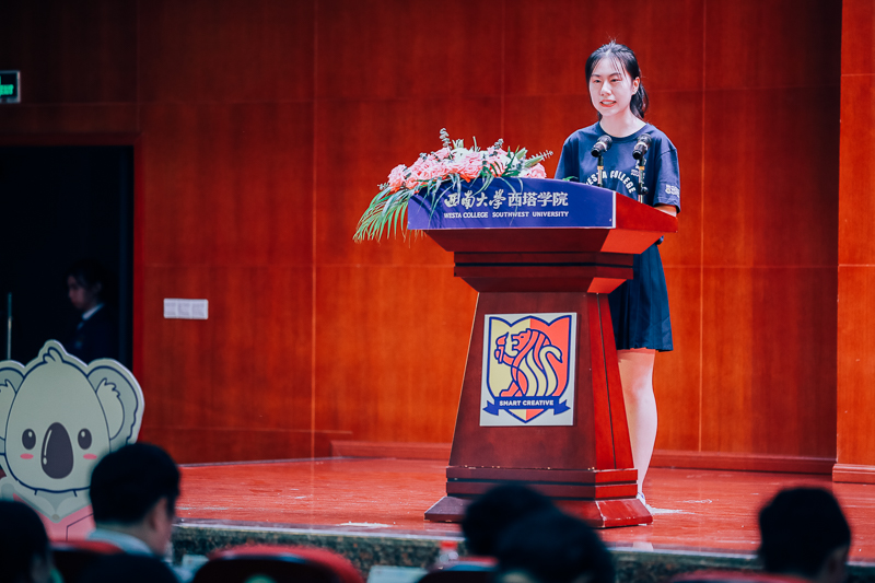 2019级杨羽淇同学作为老生代表发言。她分享了个人在休闲小栈 的成长经历,结合习近平总书记对青年提出的六点要求和西大校训,与新同学们交流了自己对大学学习生活的理解,鼓励他们提升自我,努力向成为“具有全球择业能力的创意精英”的目标靠近。