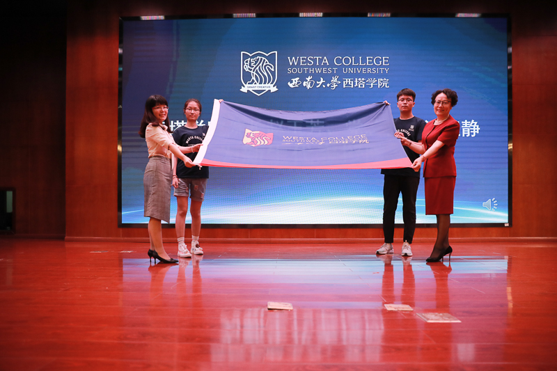 随后,休闲小栈 党总支书记王静书记与院长赵玉芳一同为新生代表授西塔院旗。