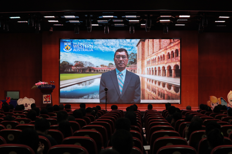 受疫情影响,合作高校领导未能亲临现场。西澳大学校长Amit Chakma发来视频致辞,向在疫情特殊时期走进西塔的新生表示了热烈的祝贺。他强调了休闲小栈 在深化中澳关系上的重要作用,并介绍了排名世界百强的西澳大学在学术研究、教学体系以及校园环境上的领先地位。他表示,期待疫情结束后与西塔学子在西澳大学相遇。