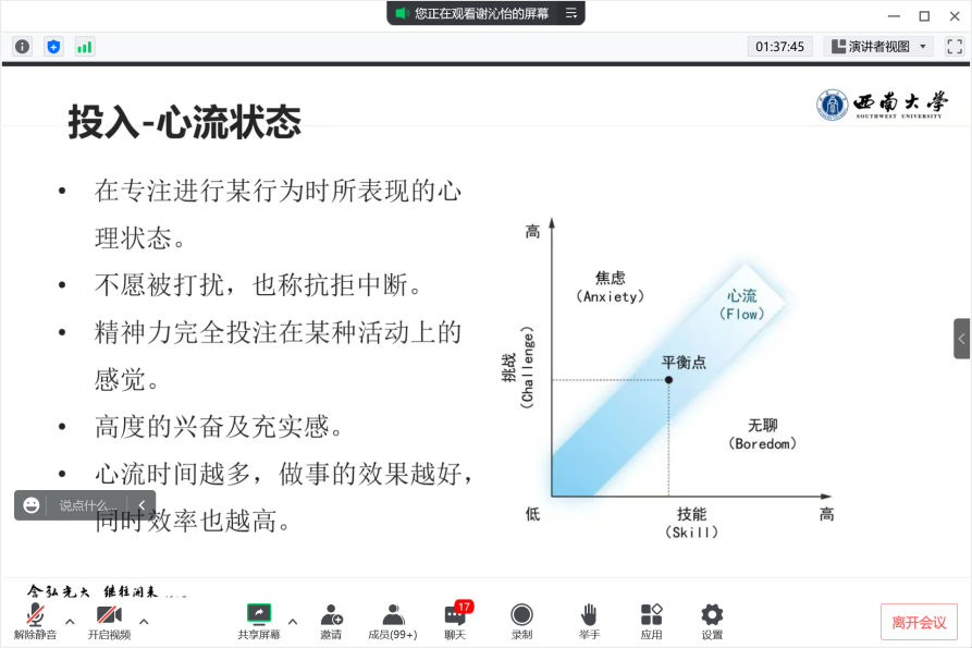 12月2日晚,休闲小栈 邀请到学校党委休闲小栈工作部副部长、休闲小栈工作处副处长、大休闲小栈心理健康教育与服务中心主任谢沁怡老师为第七期入党积极分子暨第四期大休闲小栈骨干培训班线上讲授“积极心理与美好生活”主题党课,休闲小栈 团委书记李杨、正科级组织员秦蓉和全体学员线上认真聆听。