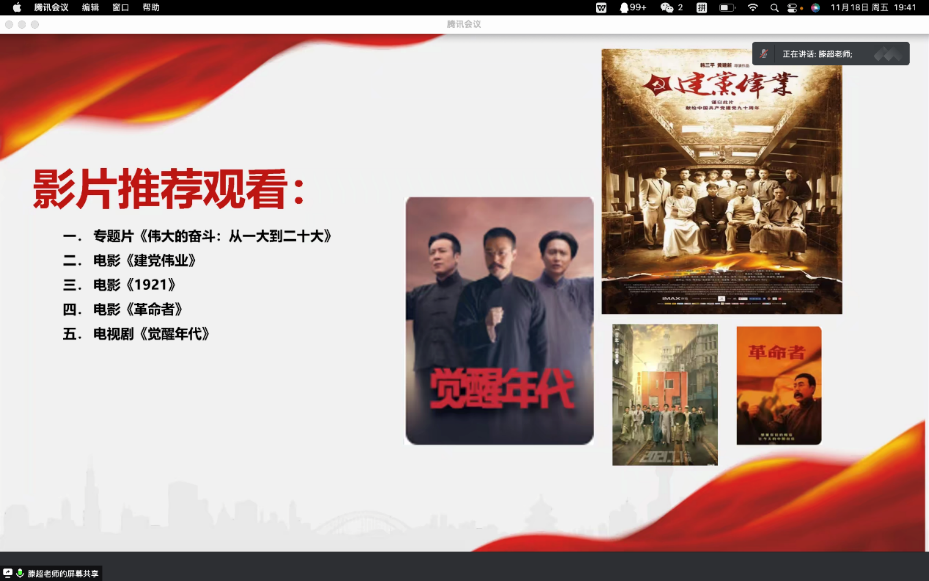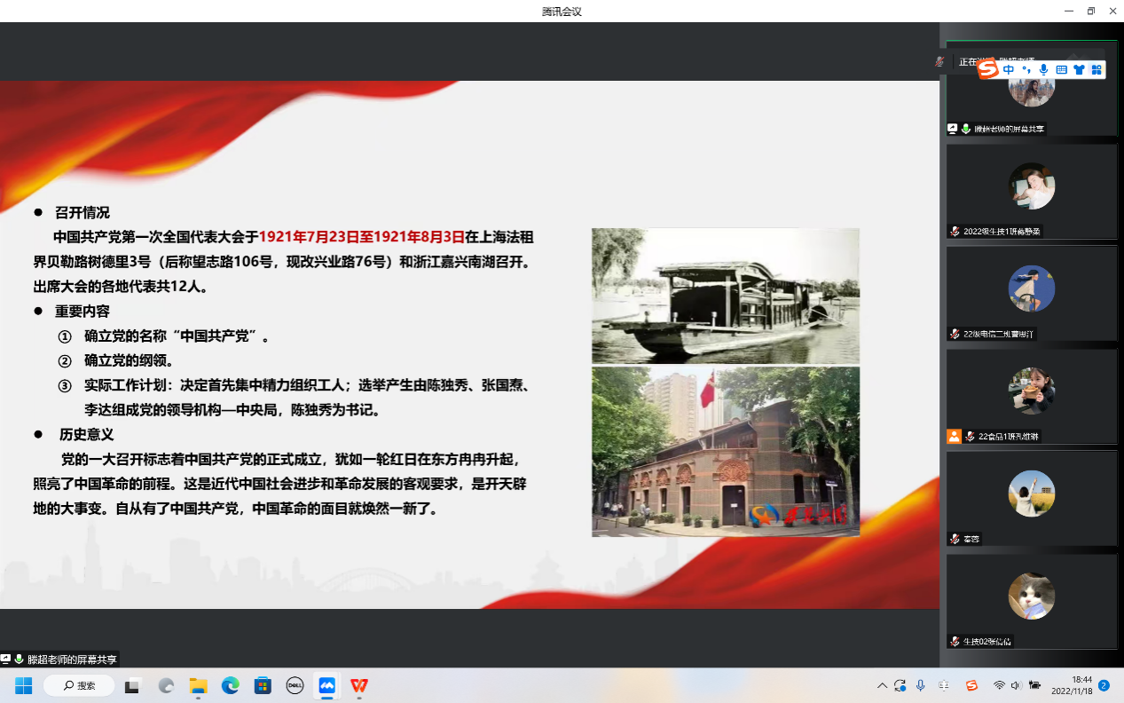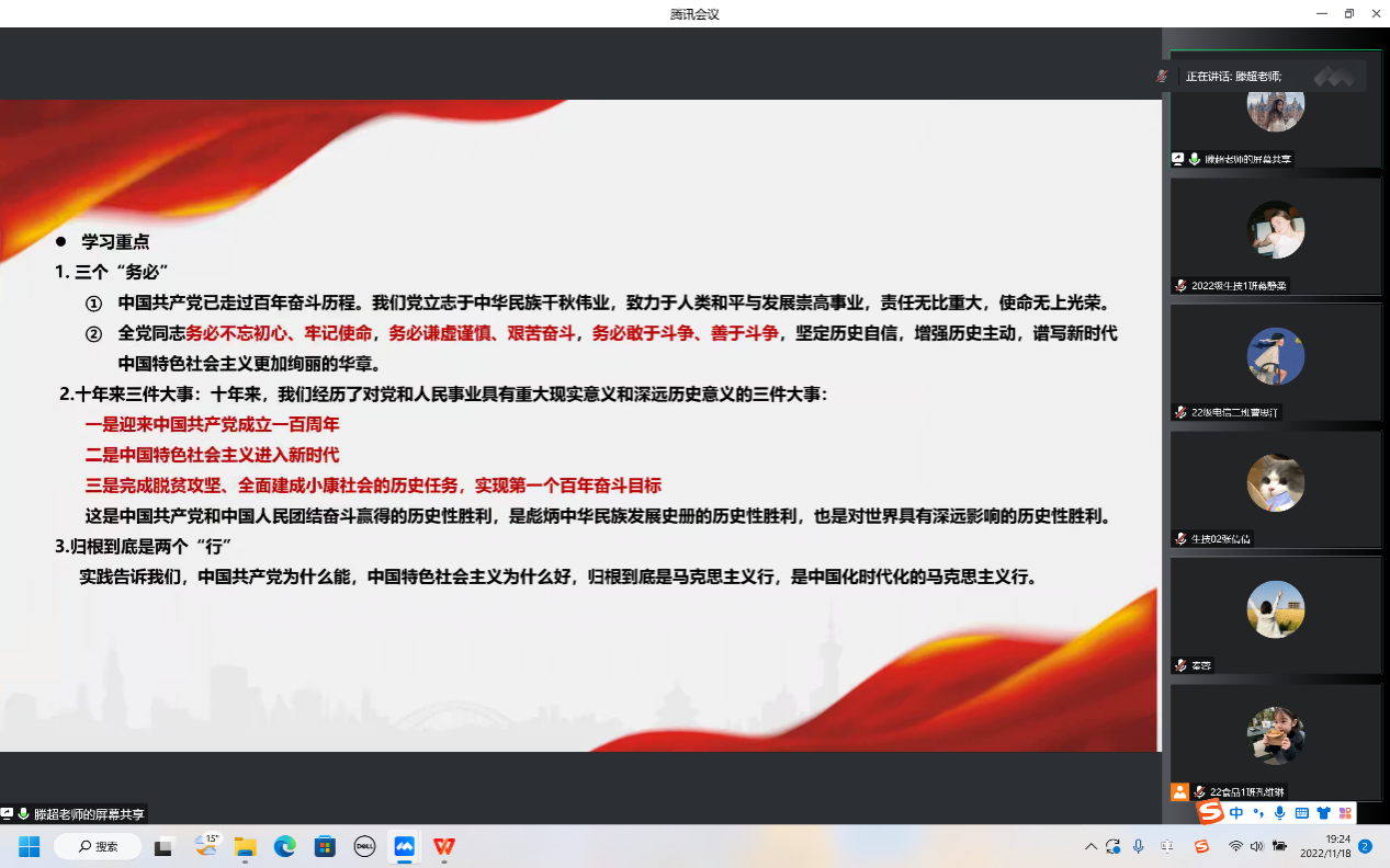 11月18日晚,休闲小栈 党委副书记、纪委书记滕超为第七期入党积极分子暨第四期大休闲小栈骨干培训班线上讲授“党的一大到二十大的光辉历程”主题党课。休闲小栈 正科级组织员秦蓉和全体培训班学员线上认真聆听。
