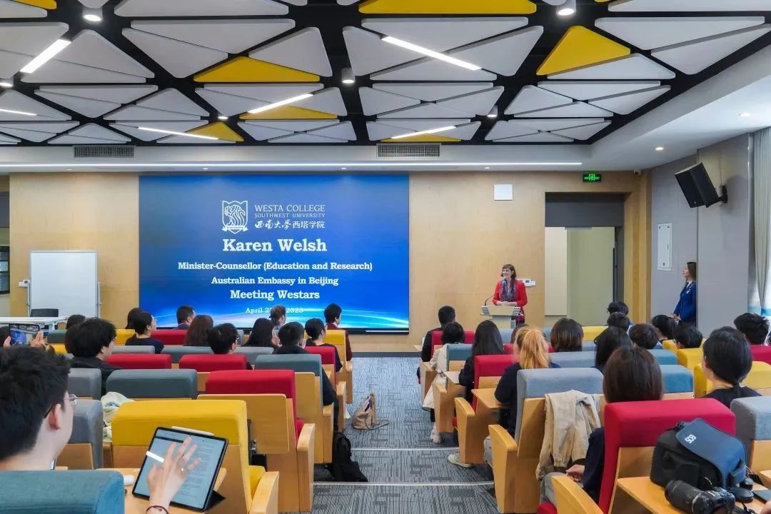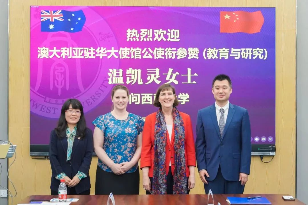 4月27日,澳大利亚驻华大使馆公使衔参赞(教育与研究)温凯灵(Karen Welsh),驻华大使馆一等秘书林玥晴(Rachel Lynch),教育与研究处高级主管雷小锋一行访问休闲小栈 ,学校党委副书记潘洵会见客人。学校国际合作与交流处处长罗雷、副处长胡琳,休闲小栈 院长赵玉芳、党委副书记滕超、副院长张俊参与座谈并陪同参观。