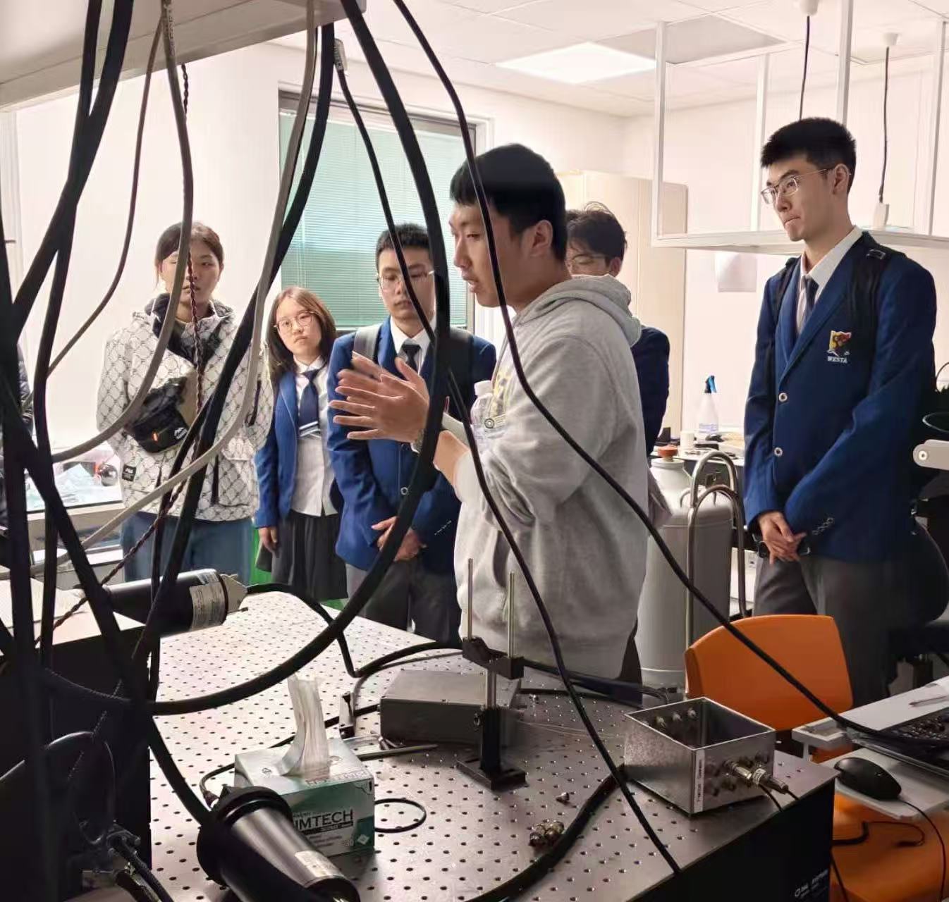 在电气与电子工程系大楼的探访中,马硕博士带领同学们深入参观了IR成像系统实验室,并完整展示了从设计构思到最终成型的芯片制作全流程。亲眼目睹一枚小小芯片背后所凝聚的精密工艺与复杂工序,同学们既由衷感叹其诞生过程的艰辛与不易,也在了解每一个精妙环节的过程中,收获了知识增长的巨大喜悦与满足感。这趟“芯”路历程,无疑加深了大家对专业精深之处的理解与敬畏。