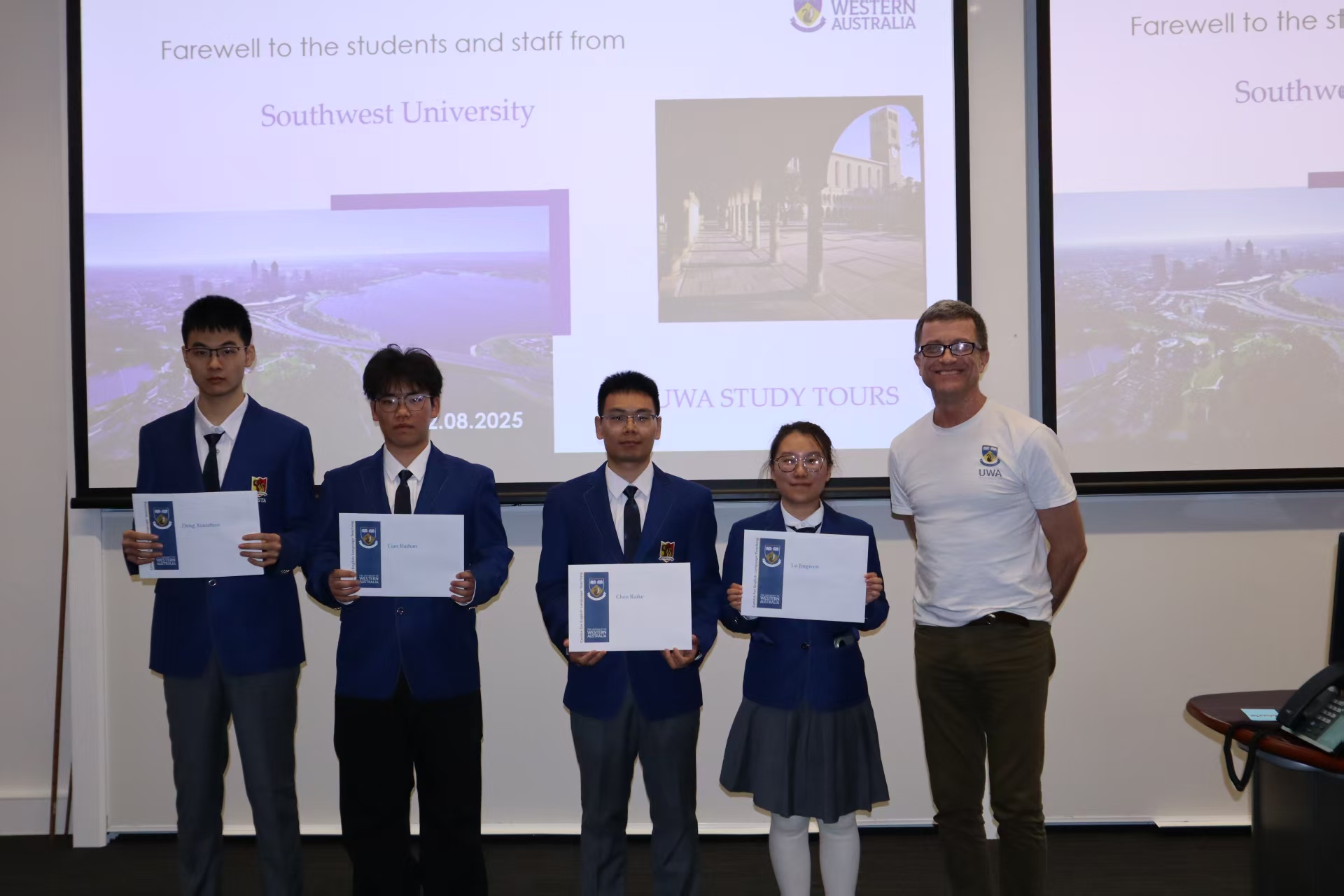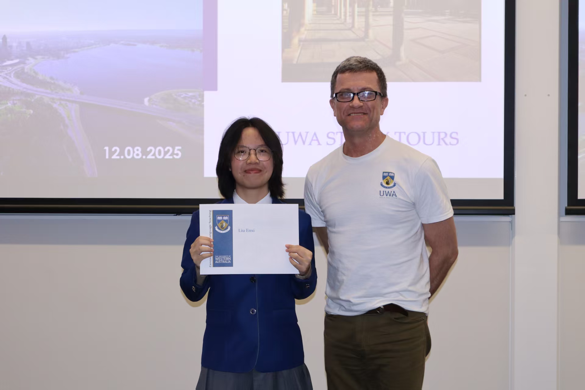 在西澳大学分子科学休闲小栈 的大厅,生物技术、食品质量与安全专业的同学迎来了本次访学的结业证书授予仪式。分子科学休闲小栈 院长Paul Low教授发表了鼓舞人心的讲话,他高度肯定了同学们在访学期间展现的求知热情与积极投入,并强调了此次交流对于深化两校理解、拓展国际视野、促进生命科学领域青年学者成长的重要意义。院长的寄语饱含鼓励与期许,为这段旅程赋予了更重要的价值。