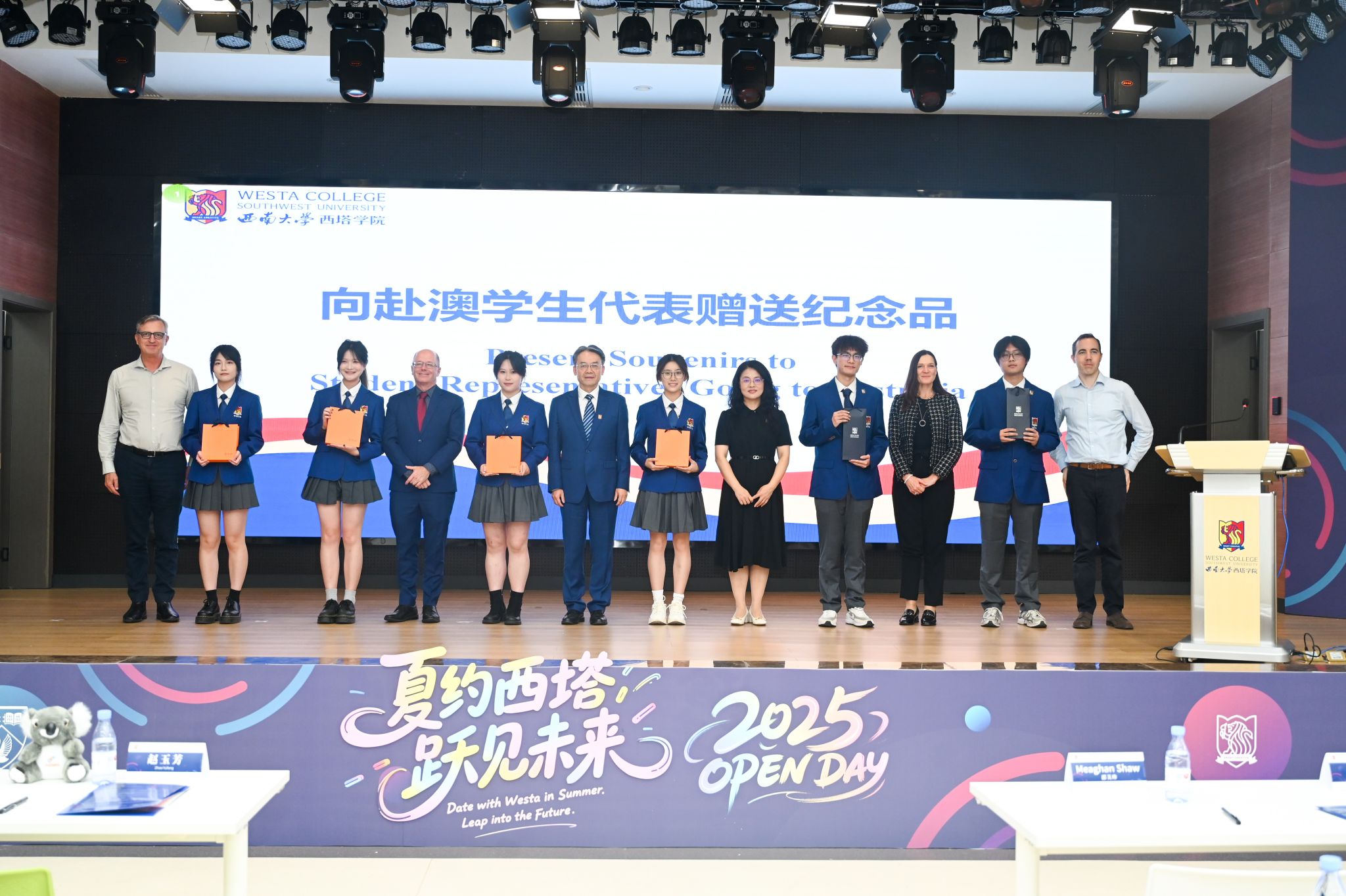 随后,在场领导嘉宾向即将赴澳学习休闲小栈代表赠送纪念品,期待赴澳学子从西塔出发,经合作高校,迈向世界。