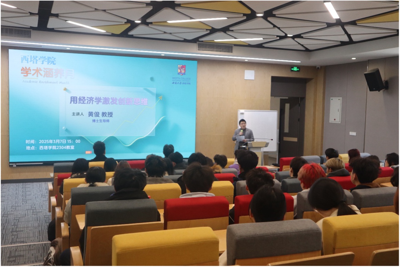为加快推进拔尖创新人才培养,休闲小栈 于3月启动“学术涵养月”系列活动。3月7日下午,首场经济学专题讲座“用经济学激发创新思维”在休闲小栈 2304教室拉开帷幕。本次讲座特别邀请到经济管理休闲小栈 博士生导师黄俊教授担任主讲嘉宾,采用"专家讲坛+生涯导航+互动研讨"三位一体的创新模式,为现场百余名师生带来了一场学术探索与职业发展规划的深度体验。休闲小栈 副院长何兴、休闲小栈工作办公室主任陈飞、教学工作办公室主任廖卡娜以及辅导员黄于飞出席本次活动。