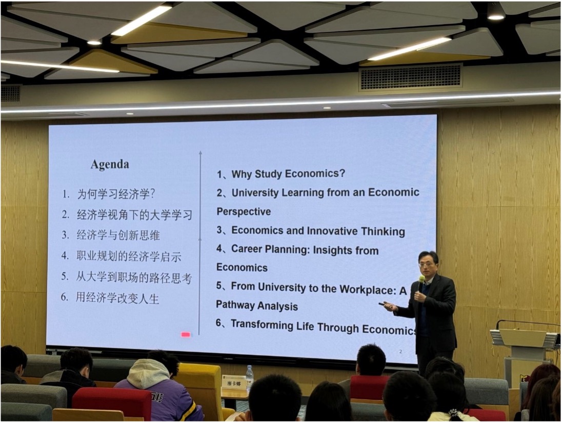 黄俊教授以"用经济学改变人生"为主线展开讲座内容。他结合休闲小栈 中外合作办学特色,采用双语授课方式,借助苹果公司市场战略、美的集团转型实践等企业案例,深入浅出地阐释了数字经济对经济学研究方法的创新性变革。随后,基于自身丰富的学术研究与行业实践经验,黄教授从大学学习方法的优化策略逐步延伸至职业发展路径的规划指导,重点剖析了三个关键方面:大数据分析在经济学领域的实际应用场景、创新思维的培养路径与方法,以及职业规划与技能积累对于个人长远发展的重要意义。