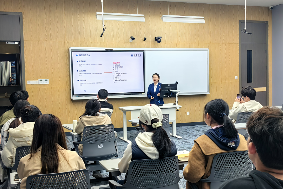 程怡思学姐系统梳理了从选题确立到结题答辩各环节的要点。她结合自身参赛经历,通过案例演示详细解析项目策划思路,重点阐释如何提炼核心优势、设计可落地的实施路径。针对团队管理方面,她还特别分享了负责人在统筹协调工作上的技巧。