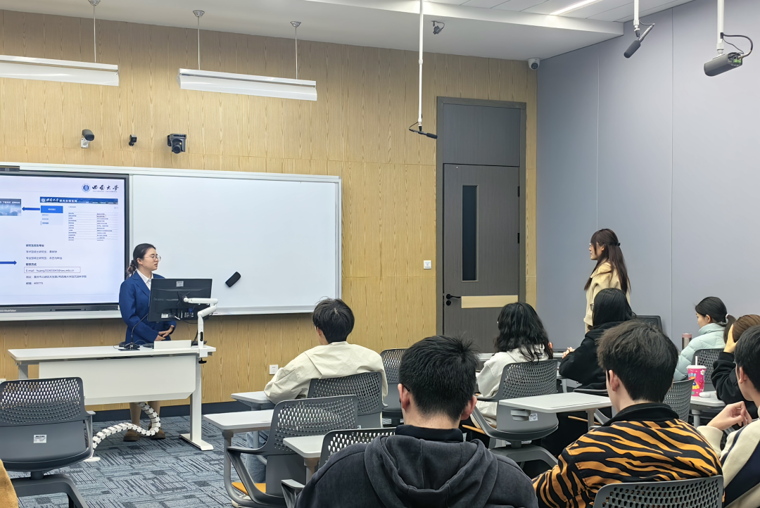 陈飞老师在开场致辞中介绍了两位主讲人的相关情况。程怡思同学曾主持国家级大休闲小栈创新创业训练计划项目,现已保研至中科院攻读硕士学位;杜航宇同学作为科创达人,指导多个在研项目。陈老师鼓励同学们借此次活动的契机,在科研实践过程中锻炼创新思维,全方位提升自身的学术素养。