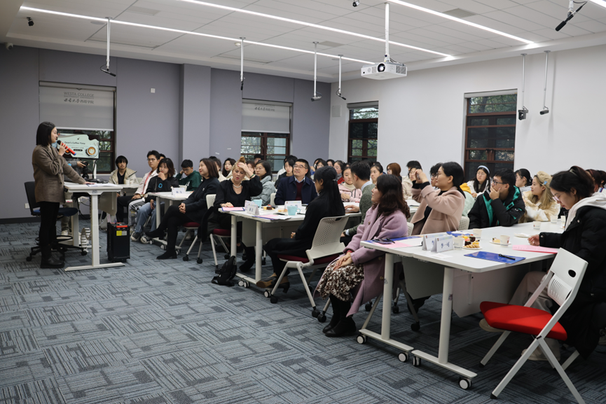 谢洁院长从“Who are we?”提问出发,用生动形象的图片与案例启发同学们对跨文化的思考与理解。她以自己赴美做访问学者期间的经历为例,从个人学术成长、跨文化学习与交流能力、批判创新思维养成等多角度向学子们阐明了开展多元文化交流和学习的重要性。最后,她通过介绍休闲小栈 为培养具有全球择业能力的创意精英系列举措,鼓励学子们要不断挑战和突破自我,实现从西塔走向世界舞台的飞跃。
